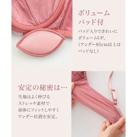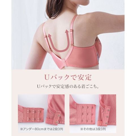 | 仕 様 | ブラ ・ホックの数:2段3列 ・3/4カップ ・パッド:あり(取り外し可) ・パッドポケット:あり ・肩紐取外し:不可 ・ワイヤー入り ・サイドボーン:あり ショーツ ・伸縮性:バックのみ縦横にあり ・クロッチ:付き ・透感:なし |