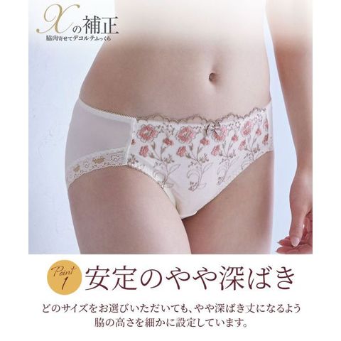 やや深ばき丈なので、ヒップを優しく包み込み、安定したはき心地。縦横に伸びるストレッチ素材が、身体の動きに合わせてぴったりフィットします。脚口はバックレース仕様で、パンツスタイルでもショーツラインがひびきにくいのが魅力です。
