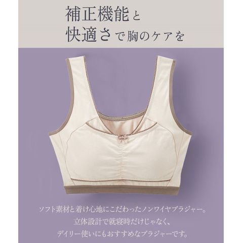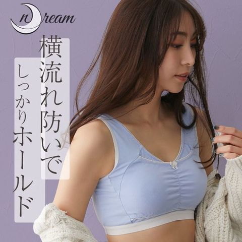 就寝時にもおすすめの、ニッセンオリジナルブラジャー「n,Dream」。ワイヤーやサイドボーンなしでも、バストを寄せて安定させるパネル構造で、寝返りを打ってもバストの揺れや流れを防止します。