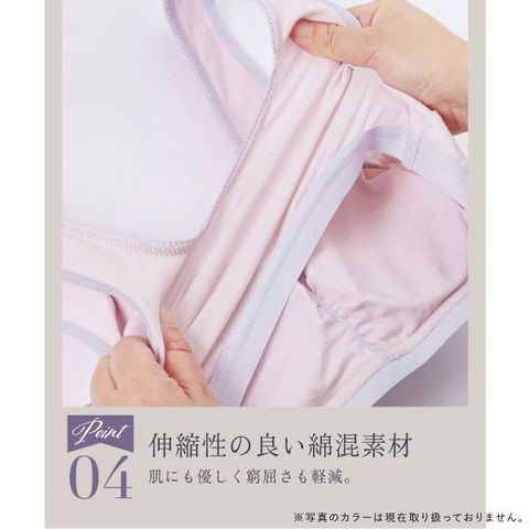 | 素 材 | 身生地:綿95% ポリウレタン5% アンダーゴム:ナイロン75% ポリウレタン25% 衿・袖ぐりゴム:ナイロン75% ポリウレタン25% |