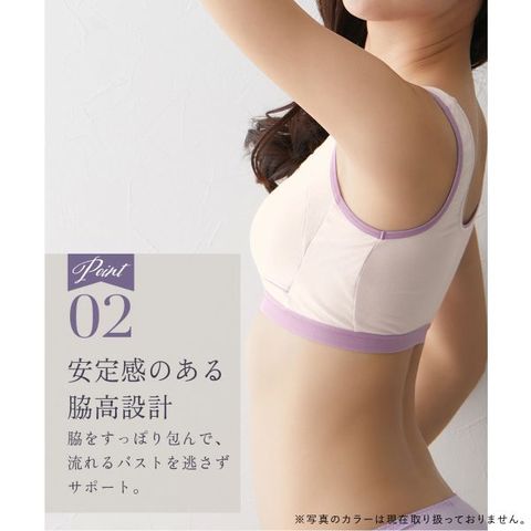 幅広ストラップが肩への食い込みを防ぎ、快適な着け心地。脇高設計で脇のお肉まですっきり整えます。バストを寄せて安定させるパネル&包み込むようなパターンでバストの流れを防止。肌に優しい綿混素材を使用し、デリケートな肌にも安心。
