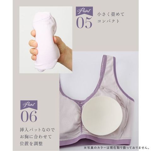 | 仕 様 | ・フルカップ ・ホックなし、かぶりタイプ ・パッド:あり(取り外し可) ・パッドポケット:あり |