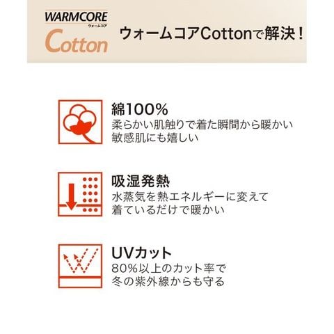 天然素材100%にこだわった「ウォームコアコットン」タートルネック長袖インナーは、着た瞬間のひんやり感がない、やさしい着心地のあったかインナーです。合繊素材が苦手な方や、冬の乾燥で肌がかゆくなりがちな方におすすめ。