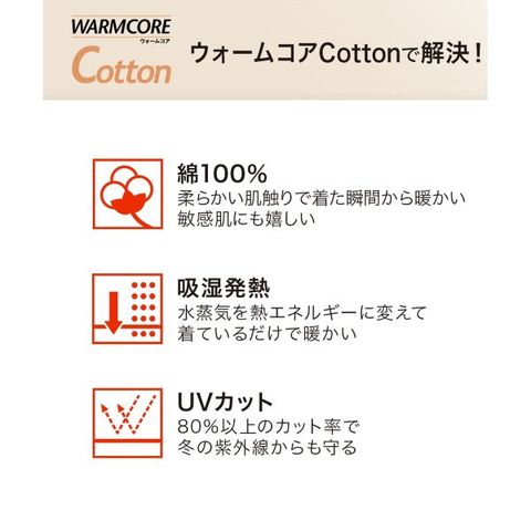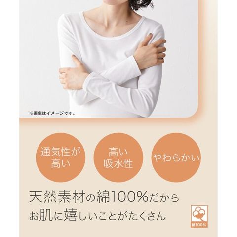 天然素材100%にこだわった「ウォームコアコットン」ロング丈長袖インナーは、着た瞬間のひんやり感がない、やさしい着心地のあったかインナーです。冬の乾燥で肌がかゆくなりがちな方や、合繊素材が苦手な方におすすめです。