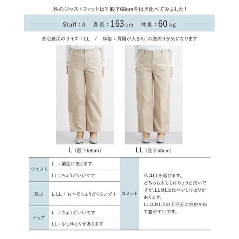 | 仕 様 | ・股上:Lサイズ約27cm LLサイズ約28cm 3Lサイズ約29cm ・股下:L-3L約68/73cm ・ウエスト:Lサイズ約72cm LLサイズ約79cm 3Lサイズ約86cm ※メーカーサイト寸法 ・前ボタン ・前ファスナー開き ・使用可能ベルト幅約4cm |