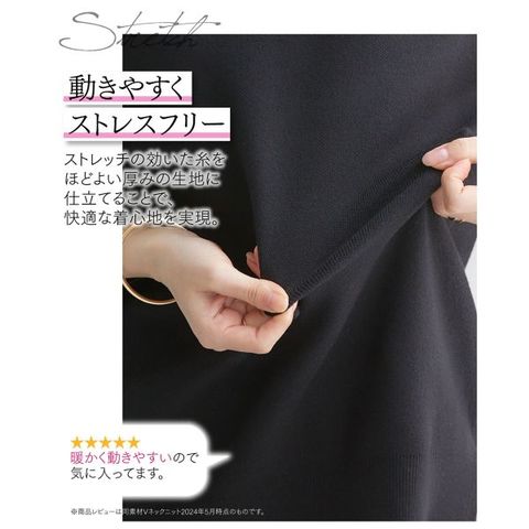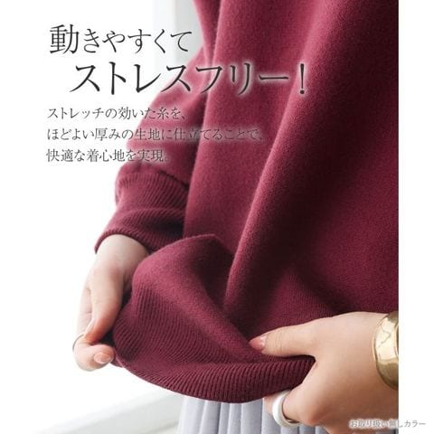 チクチクしにくいモチモチとしたやわらかさと、ストレッチの効いた素材で、快適な着心地を実現。マキシスカートやスラックスと合わせて女性らしく、またカジュアルに楽しむのもおすすめです。