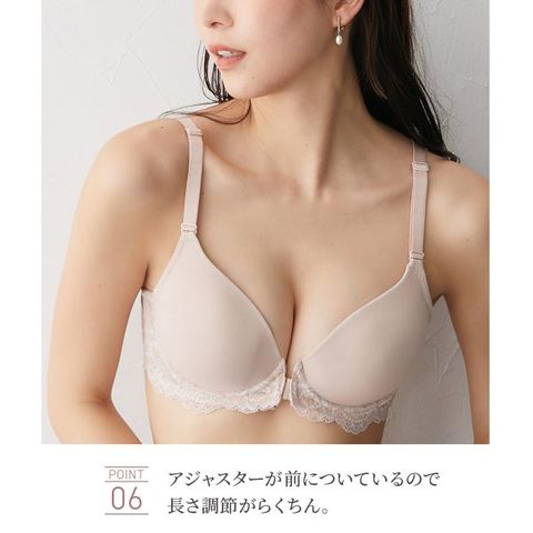柔らかい素材でバストに優しくフィット。着脱が楽なフロントホックと、前で調節できるストラップで、手軽にバスト位置を合わせられます。