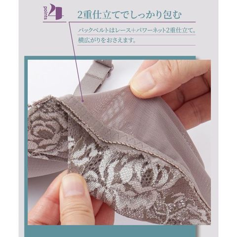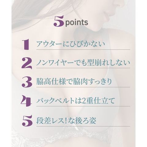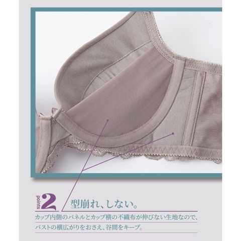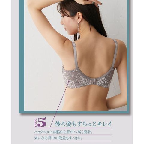 ワイヤーなしでも、内蔵されたパッドで自然なボリュームアップを叶えるブラジャー。脇高設計で気になる脇肉をサポートし、すっきりとしたシルエットを演出します。