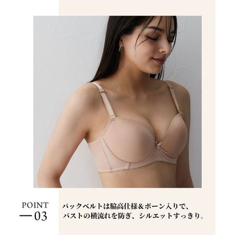 アウターに響きにくい、縫い目のないシームレスカップを採用したブラジャー。気になる脇肉をサポートする脇高仕様で、すっきりとしたシルエットを叶えます。