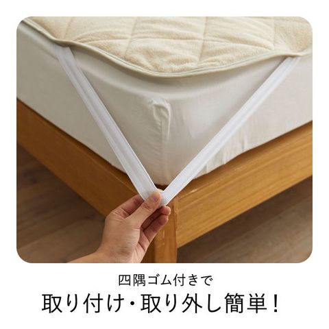 吸水性に優れているため、寝汗をかいてもサラッとした使い心地。四隅ゴム付きで、ずれにくく、取り付け・取り外しも簡単です。ご家庭の洗濯機で手軽に洗えるので、いつも清潔にお使いいただけます。