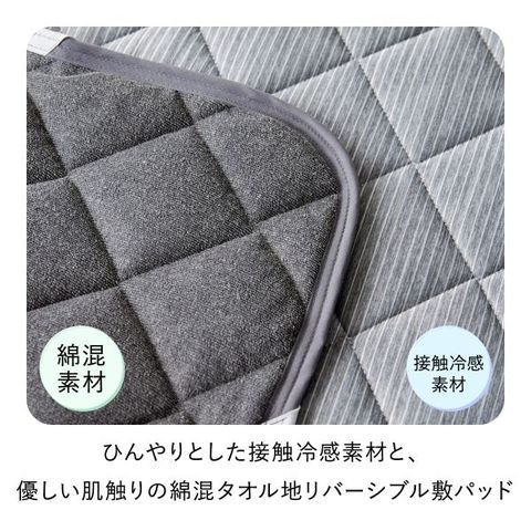 ひんやりとした接触冷感素材と、優しい肌触りの綿混タオル地のリバーシブル敷パッド(セミダブル)です。季節や気分に合わせて使い分けられます。