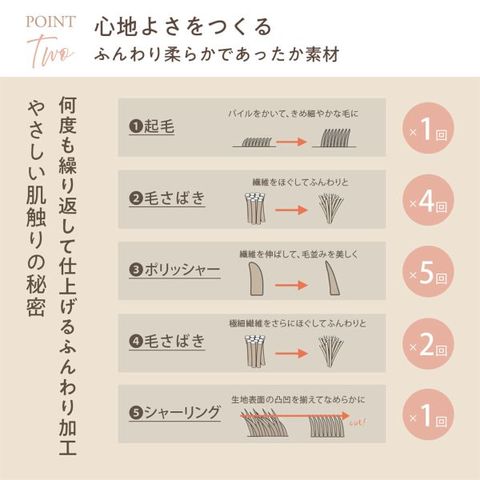 何度も丁寧に繰り返したふんわり加工で、極上のなめらかさを実現。静電気軽減加工が施されており、冬の気になるパチパチを抑えます。洗濯機で丸洗い可能で、いつでも清潔に保てます。