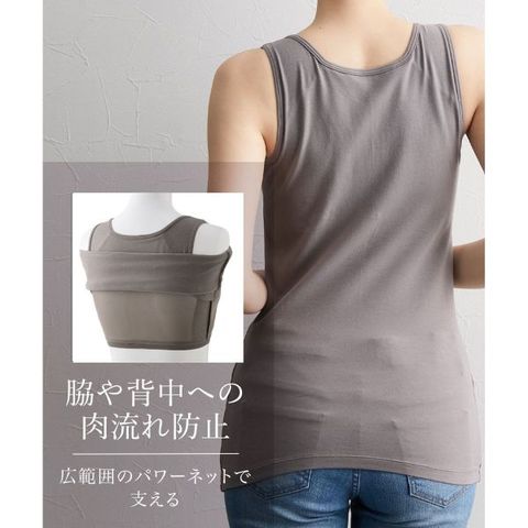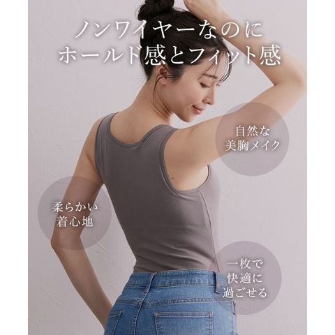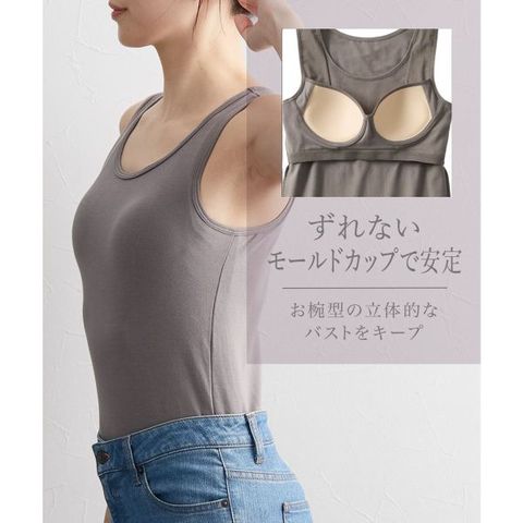 脇部分をすっきりさせる設計で、もたつきを軽減。内蔵されたカップがバストラインを自然に整え、程よいサポート感で安心です。