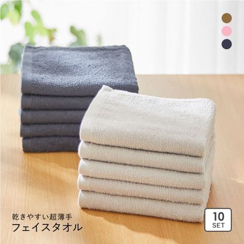 毎日使いにぴったりの乾きやすい超薄手タイプのフェイスタオル10枚セット(ニッセン Dailycolor)。薄手なのに吸水性も備えており、お洗濯後の乾きが早いのが特長です。