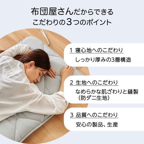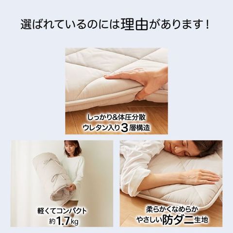 軽くてしっかり、手軽に持ち運べるこだわりのごろ寝マットです。ヘタリにくい高反発ウレタンを芯材に、ふんわりとした中わたを巻いた3層構造で、まるで敷布団のような寝心地を実現しました。