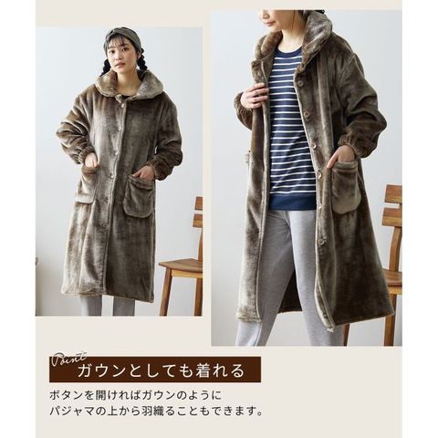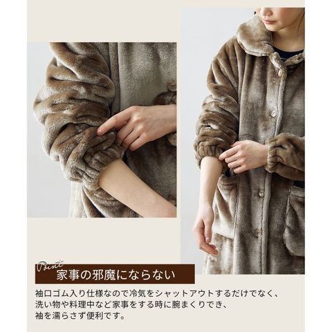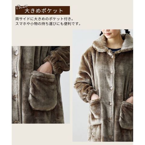 前ボタンを開ければガウンとしても活躍し、パジャマの上からさっと羽織れます。袖口はゴム仕様で家事がしやすく、両サイドの大きめポケットも便利。