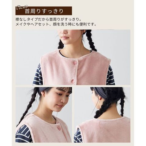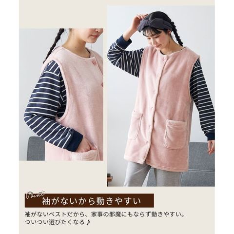 袖がないため、家事や作業の邪魔にならず動きやすいのが特長。襟無しタイプで首まわりがすっきりしているから、メイクや洗顔時にも便利です。