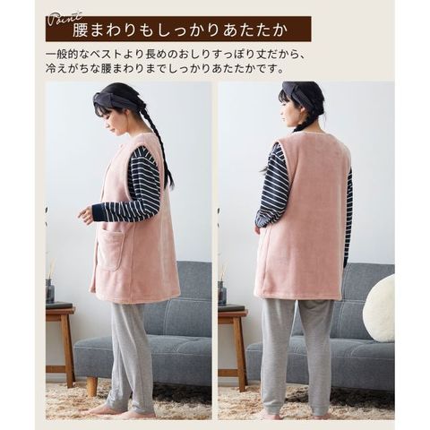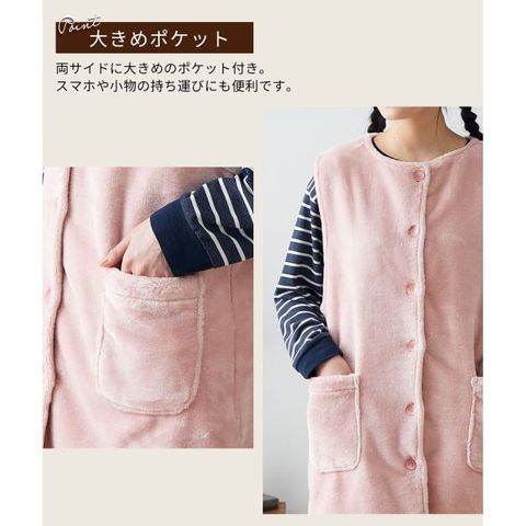 お尻まですっぽり隠れる丈で、冷えやすい腰まわりもしっかり保温。前開きボタンでサッと羽織れ、大きめポケットも付いて機能的。ご家庭で丸洗いOKなので、いつでも清潔。防寒対策やプレゼントにおすすめのプラスワンアイテムです。