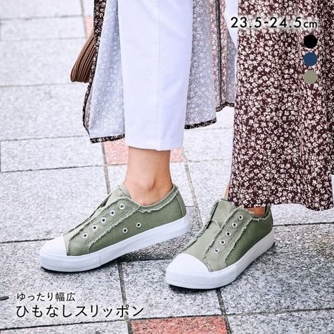 毎日のカジュアルスタイルに欠かせない、ゆったり幅広タイプ(ワイズ4E)のスリッポンスニーカー。切りっぱなしのデザインが可愛らしく、足元にこなれ感をプラスします。