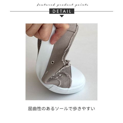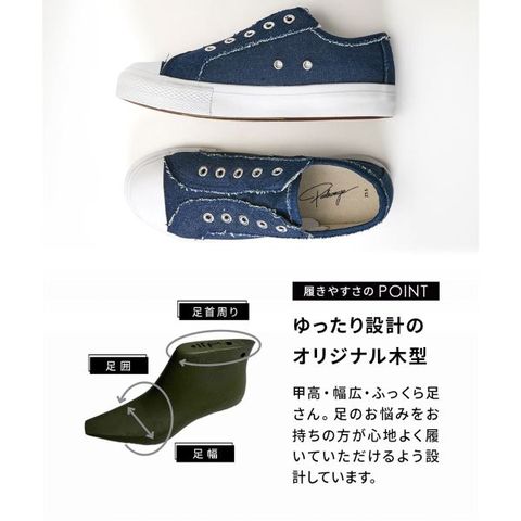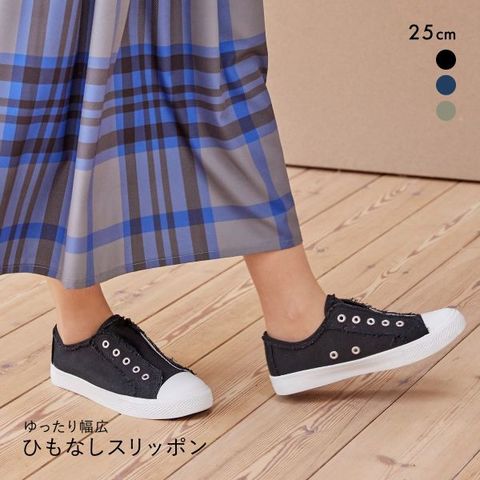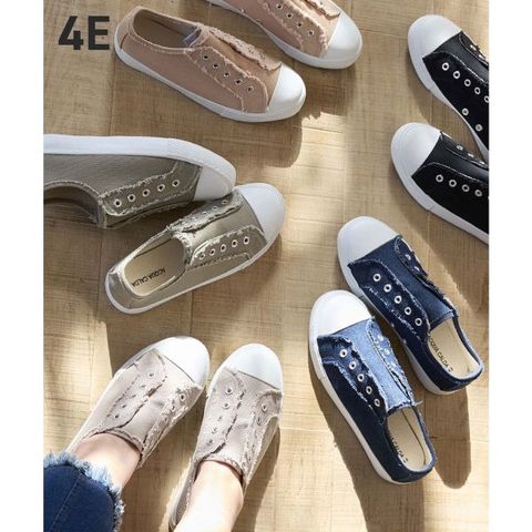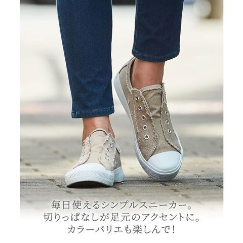 毎日のカジュアルスタイルに欠かせない、ゆったり幅広タイプ(ワイズ4E)のスリッポンスニーカー。切りっぱなしのデザインが可愛らしく、足元にこなれ感をプラスします。