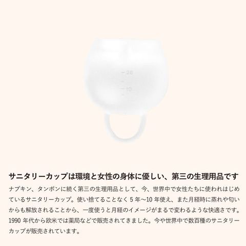 20mlの容量で、少ない日から多い日に最適。旅行や水泳などのシーンにも役立ちます。環境にも優しく、使い捨てずに5~10年使用可能。月経時の蒸れや匂いを軽減し、快適なサニタリーライフを提供します。医療用シリコン100%で柔らかく、漏れにくいデザイン。最大12時間の連続使用が可能で、取り出しやすいリング付きです。
