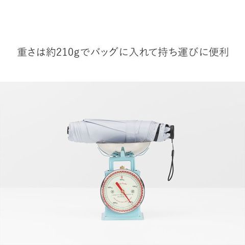 UVCUTと99.9%遮光の生地を使用し、高い遮熱性と耐水圧を兼ね備えています。直径約98cmの大きさで、手動開閉式ながら210gの軽さを実現。