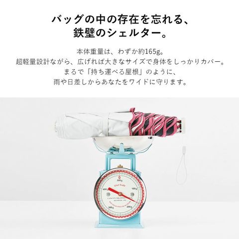 本体重量は、わずか約165g。持っていることさえ忘れてしまうほどの超軽量設計ながら、広げれば大きなサイズで身体をしっかりカバー。まるで「持ち運べる屋根」のように、雨や日差しからあなたをワイドに守ります。