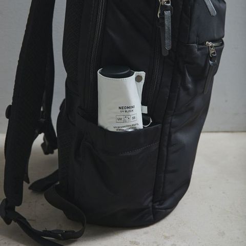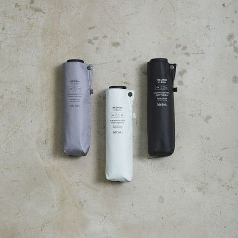 WaterfrontのLESSISMOREシリーズ『ネオミニUVブロック』ユニセックス日傘折。開くと通常サイズ、たたむとコンパクト。従来品より25%小さくなりました(Waterfron社比)。