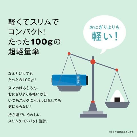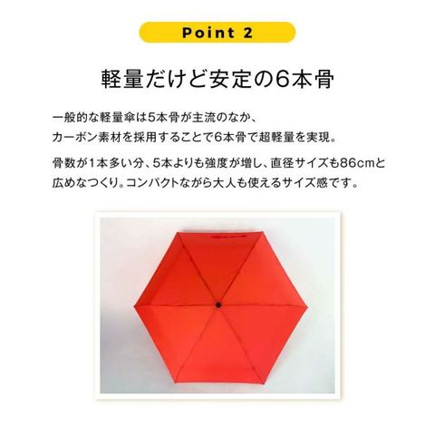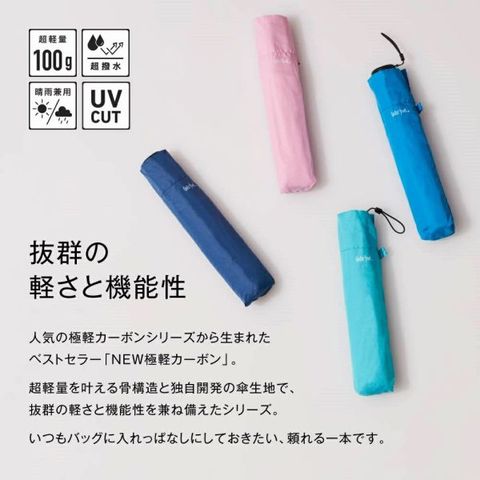 超軽量を叶える骨構造と独自開発の傘生地で、抜群の軽さと機能性を兼ね備えたシリーズです。重さは立った100g!スマホよりも軽い設計。軽量ですが、安定の6本骨で強度が増し、直径サイズも86cmと広めなつくりで、大人も使えるサイズ感です。