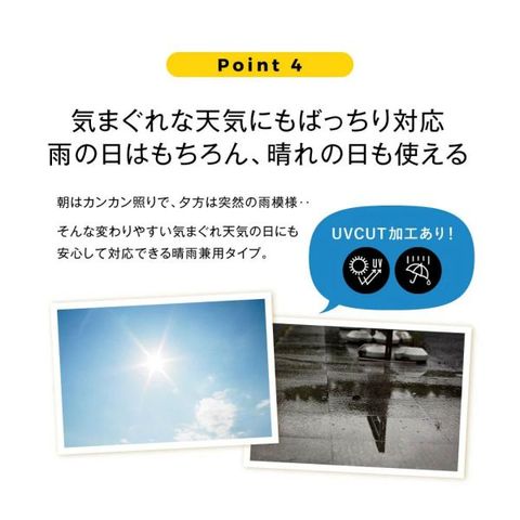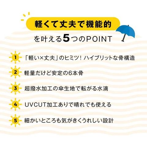 超撥水加工で、軽く振るだけで水滴をしっかりはじきます。雨の日はもちろん、晴れの日にも使用していただけるUVカット加工。いつもバッグに入れっぱなしにしておきたい、頼れる一本です。