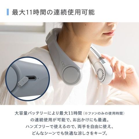 大容量バッテリーにより最大11時間(※ファンのみの使用時間)の連続使用が可能なので、お出かけにも最適です。ハンズフリーで使えるので、両手を自由に使え、どんなシーンでも快適な涼しさをキープ。
