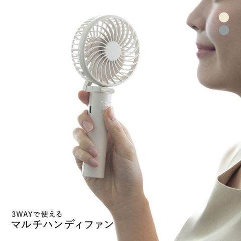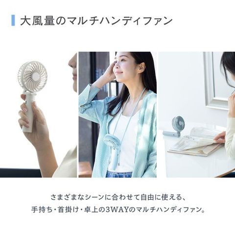 手持ち・首掛け・卓上の3WAYで使えるマルチハンディファン。