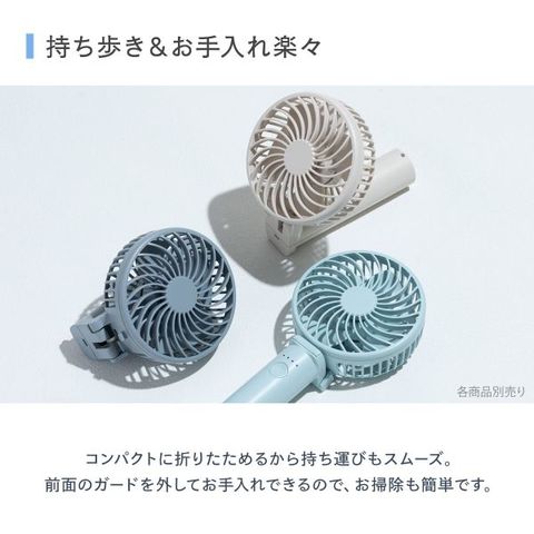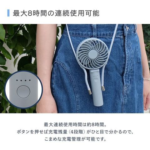 持ち手を折りたたんでデスクファンにしたり、ネックストラップをつけて首から下げたり、シーンに合わせて自由に使えます。