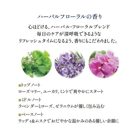 心ほどけるハーバル・フローラルブレンドの香りで、バスタイムが深呼吸したくなるようなリフレッシュタイムに。大人の髪悩みに寄り添い、毎日を美しく輝かせます。