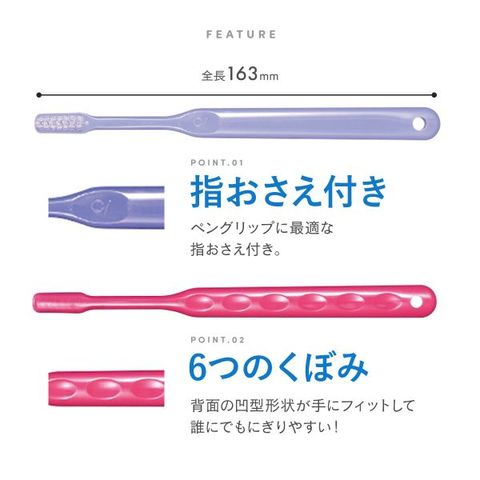 小学校高学年から大人まで、幅広い年代の方の手にフィットするCiPRO 歯ブラシM ふつう です。グリップ背面には、6つのくぼみを設けることで、手の大きさや握り方に関わらず、誰にでも握りやすい設計を実現しました。