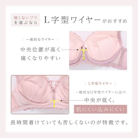 ブラはフロント低めのL字ワイヤーで、肌にくい込みにくく軽い着け心地。フロントのクロステープは胸をぎゅっと引き寄せ、二股ストラップで美しい谷間を中心にキープ。