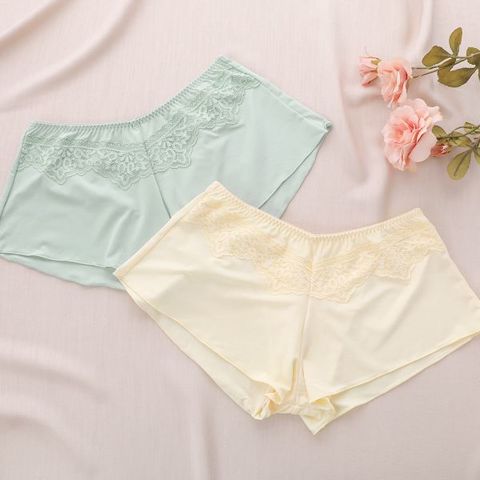 リラックス感あふれるコンフォートショーツ。華やかなレースとクラシカル調の編みレースをミックスした大人かわいいデザインです。