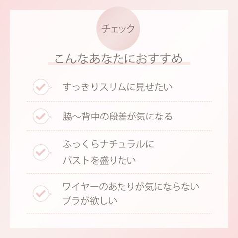 脇高・フラットな設計で、脇や背中の段差をすっきりスリムに整え、アウターをきれいに着こなせます。サイドボーンがずれにくくきれいな谷間をキープ。