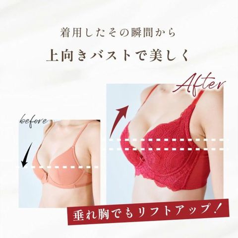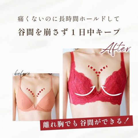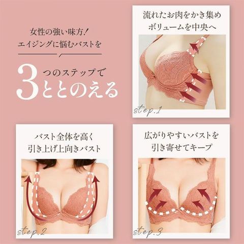 加齢や出産によって柔らかく変化したバストのお肉をしっかり中央によせ集めます。集めたお肉は潰さず持ち上げ、グッとリフトアップ。本来の正しく美しい位置で長時間キープします。分厚いパッドに頼らず、自胸で美しい谷間に出会えます。