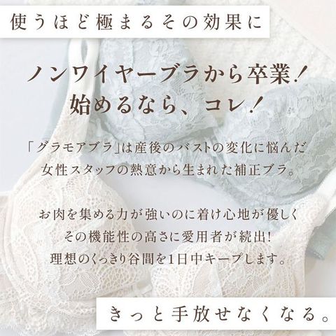 【グラモアブラ】は産後のバスト変化に悩んだ女性スタッフの熱意から生まれた補整ブラ。お肉はしっかり集めるのに着け心地が優しく、愛用者続出のブラジャーです。