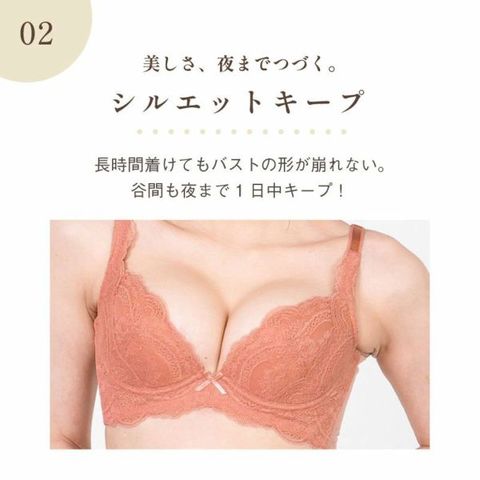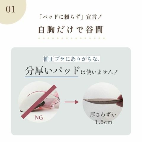 加齢や出産によって柔らかく変化したバストのお肉をしっかり中央によせ集めます。集めたお肉は潰さず持ち上げ、グッとリフトアップ。本来の正しく美しい位置で長時間キープします。分厚いパッドに頼らず、自胸で美しい谷間に出会えます。