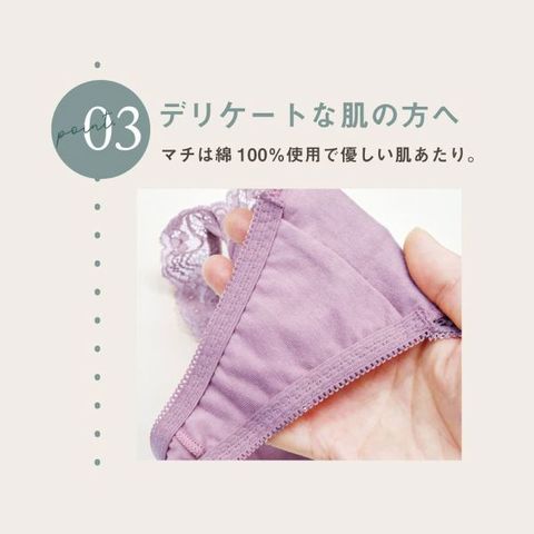 サイド細めの上品なレースでスッキリとしたデザイン。マチは綿100%で優しい肌あたり。洗濯タグ不使用なので、着用時のチクチクした不快感もありません。