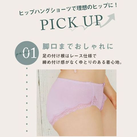 股上浅め設計のヒップハングショーツは、ボトムスを選ばずとっても便利。足の付け根部分にはレースを施し、締めつけのない快適な着用感。