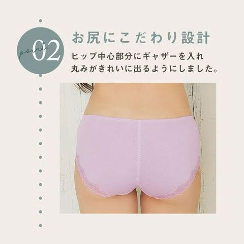 ヒップ中心にはギャザーを入れ、ヒップの丸みに沿う立体的なシルエットです。マチは綿100%の優しい肌あたり。洗濯タグ不使用で、着用時のチクチクする不快感モありません。