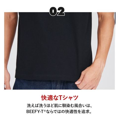 1975年に誕生したロングセラー、BEEFY-T(ビーフィーT)のクルーネックTシャツです。ヘビーウェイト(肉厚)のコットン100%生地を使用。洗えば洗うほど肌に馴染む風合いや、洗いこんでも首周りの伸びや型くずれが起きにくい強さと耐久性が特長です。アメリカンテイストを感じさせるクラシックなボックスシルエット。脇に縫い目のない丸胴編みに加え、首元にネームデザインをプリントするタグレス仕様で襟ネームの肌当たりを解消し、快適な着心地です。