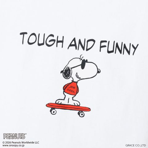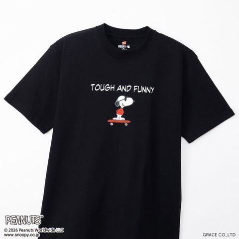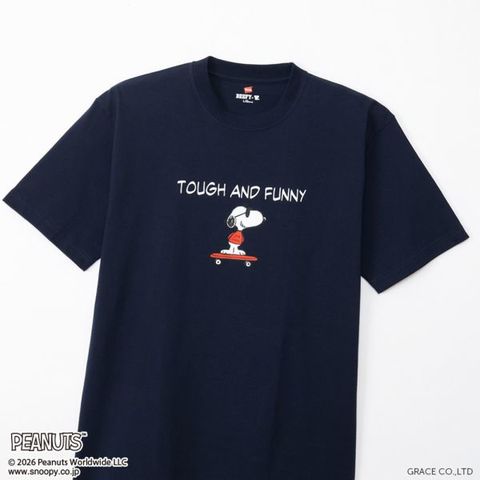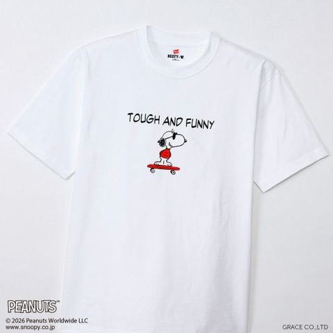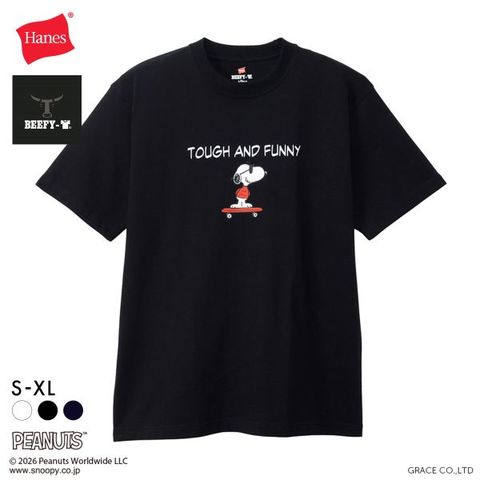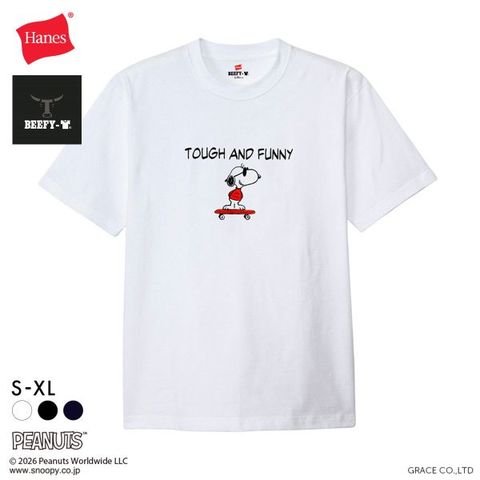 1975年に誕生したロングセラー、BEEFY-T(ビーフィーT)初のアートプリント企画。プリンタブルボディとして誕生したBEEFY-TRに、コミックやキャラクターとして世界で愛され続ける「PEANUTS(ピーナッツ)」に登場する世界一有名な犬ともいえるキャラクター、スヌーピーを採用。BEEFYのコンセプト「タフであること」が込められた「TOUGH AND FUNNY」の印象的なメッセージと、元気よくスケートボードを乗りこなすスヌーピーの変装姿のひとつ、クールな大学生に扮したJOE COOL(ジョー・クール)を胸元にデザイン。このアートはBEEFY-Tだけのオリジナルで、名前を入れたTシャツとスケートデッキの赤はヘインズのブランドカラー。ボディはBEEFY-Tで最も人気のHM1-D001クルーネックTシャツ。ヘビーウェイト(肉厚)のコットン100%生地を使用。洗えば洗うほど肌に馴染む風合いや、洗いこんでも首周りの伸びや型くずれが起きにくい強さと耐久性が特長です。アメリカンテイストを感じさせるクラシックなボックスシルエット。脇に縫い目のない丸胴編みに加え、首元にネームデザインをプリントするタグレス仕様で襟ネームの肌当たりを解消し、快適な着心地です。