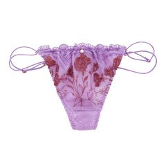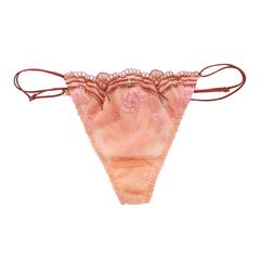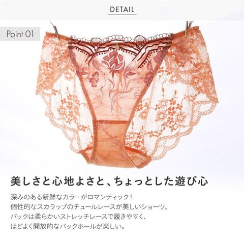 透明度の高いチュールに印象的なスカラップが美しいショーツ。ストレッチレースを使用したバックには、ブラのストラップとおそろいのストリングスを配した、モダンなバックホール。