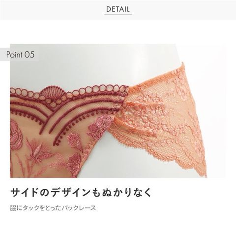 フロントレース部分は透明感を生かしながらマーキーの裏当てで透けを軽減しています。バックはヒップを柔らかく包み、アウターに響かないストレッチレース。クロッチ肌側は綿混素材。