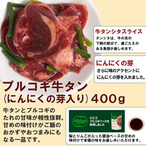 原材料名:牛タンシタロール(牛内臓肉(産地複数有り)、還元水飴、水飴、食塩、酵母エキス、さとうきび抽出物、ゼラチン、デキストリン、食用植物油脂/調味料(アミノ酸等)、pH調整剤、リン酸塩(Na)、酸化防止剤(ビタミンC)、カゼインNa、酵素)、プルコギのたれ(しょうゆ、砂糖、梨ピューレ、果糖ぶどう糖液糖、たまねぎ、にんにく、食塩、りんごピューレ、ねぎエキス、こしょう / 調味料(アミノ酸等)、酸味料、増粘剤(キサンタンガム)、カラメル色素)、にんにくの芽、(原材料の一部に乳成分・牛肉・ゼラチン・小麦・大豆・りんごを含む)