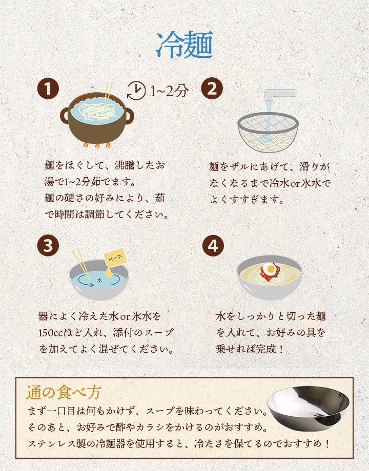 韓国冷麺のシコシコの麺とスープは全国100店舗以上の専門店に卸している、当店自慢のプロが認める品!ぜひ、ご賞味ください。